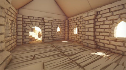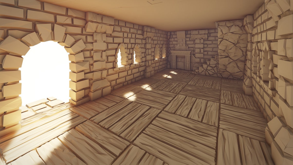 Das Erdgeschoss besteht aus einem einzigen großen Raum mit einer L-förmigen Treppe in einer Ecke. In einer anderen Ecke befindet sich ein Torbogen zu einem kleinen Turm.