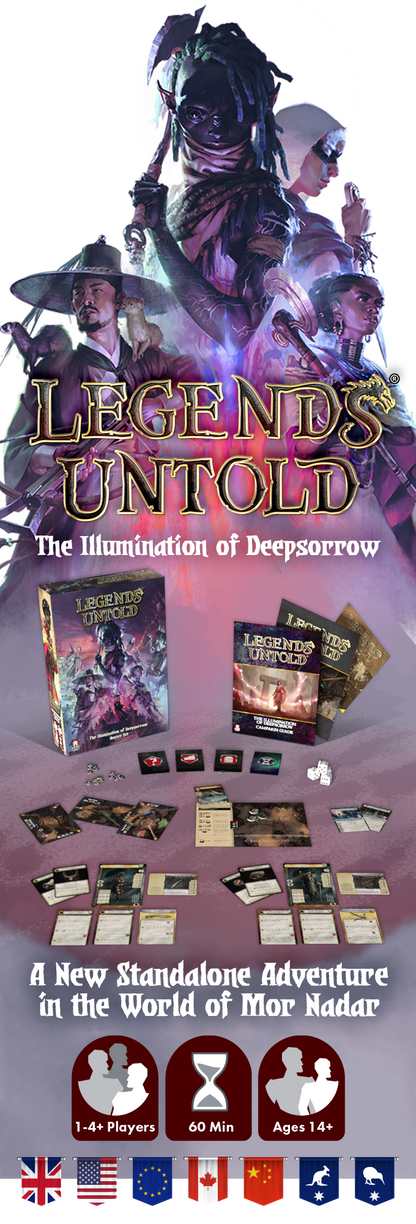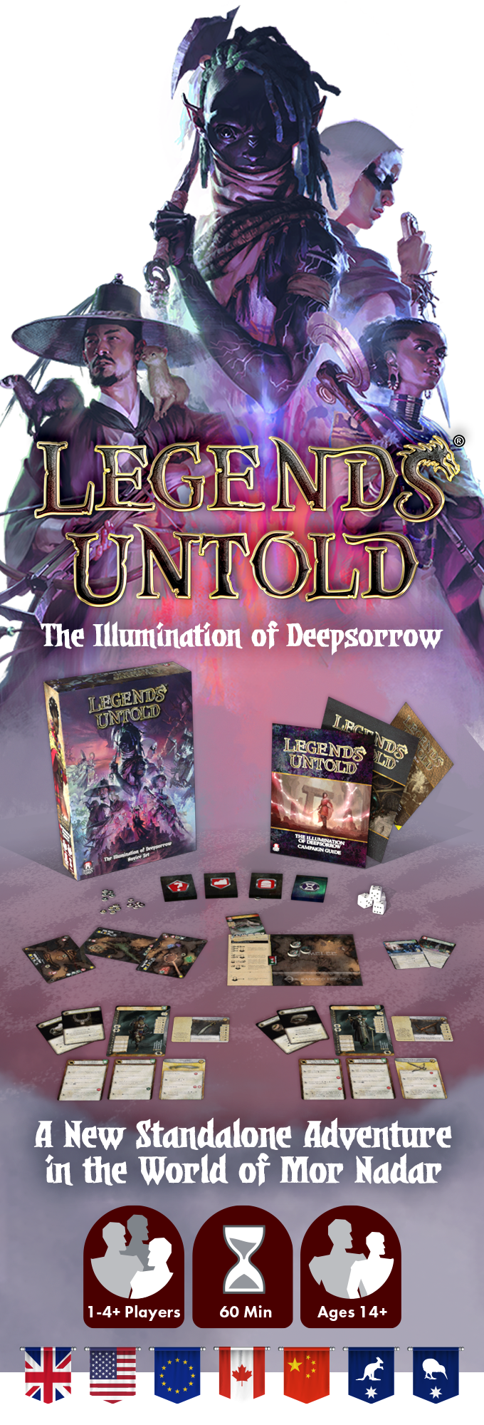 The Illumination of Deepsorrow ist eine eigenständige Erweiterung für das Legends Untold System, die mit den Novice Sets Weeping Caves und Great Sewers erweitert werden kann. Es kann auch mit diesen Produkten kombiniert werden, um einen riesigen Katalog von Karten für selbst gebaute Abenteuer zu erstellen.