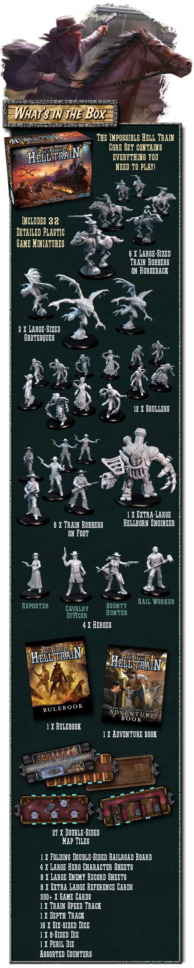 Im Basisset „The Impossible Hell Train“ schlüpft ihr in die Rolle einer Gruppe von Helden, die mit dem Zug durch das verdorbene Gebiet des amerikanischen Südwestens reisen. Mit der lang erwarteten Inbetriebnahme der Eisenbahnlinie „Western Express“ haben sich viele Neulinge vorgenommen, sich in den Badlands von Brimstone einen Namen zu machen. Aber es sind gefährliche Zeiten, und Schwärme von HellBats verdunkeln den Himmel, während Banden von Zugräubern auf die nächste Lokomotive warten, die wertvollen Dark Stone und reiche Passagiere auf der Suche nach Abenteuern transportiert.