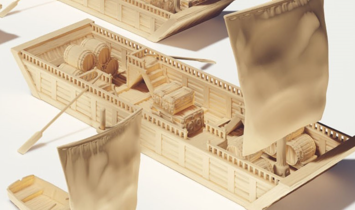 Barque 2: 200mmx122mmx375mm (Comes in 5 pieces and includes a sail, large deck, oars, barrels, boxes)