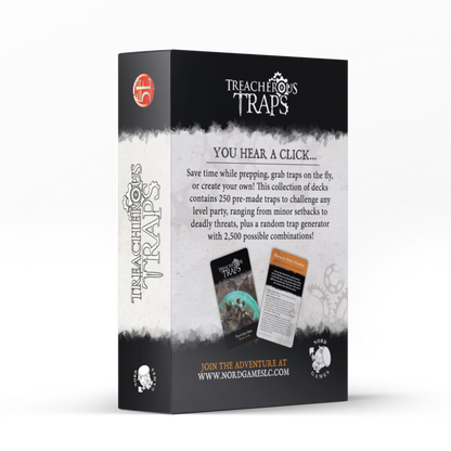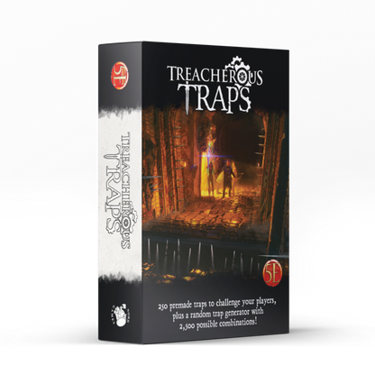 Save time preparing your dungeon, make off-the-cuff traps or create your own! This collection of decks includes 250 pre-made traps for 5E D&D that will challenge any party from minor setbacks to deadly threats, as well as a trap generator with 2,500 possible combinations!