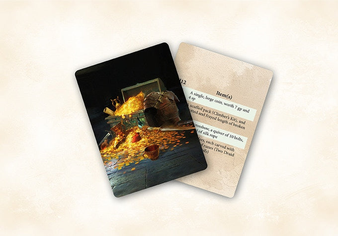 There are five 60-card decks for difficulty levels 1-4, 5-8, 9-12, 13-16, and 17-20. Each card has 4 possible loot pieces and the user rolls a 12 to determine the rarity of the result. An excellent tool to make any adventure fun and interesting!