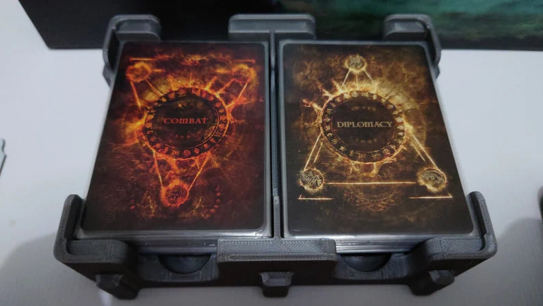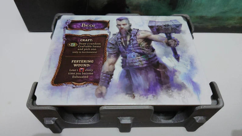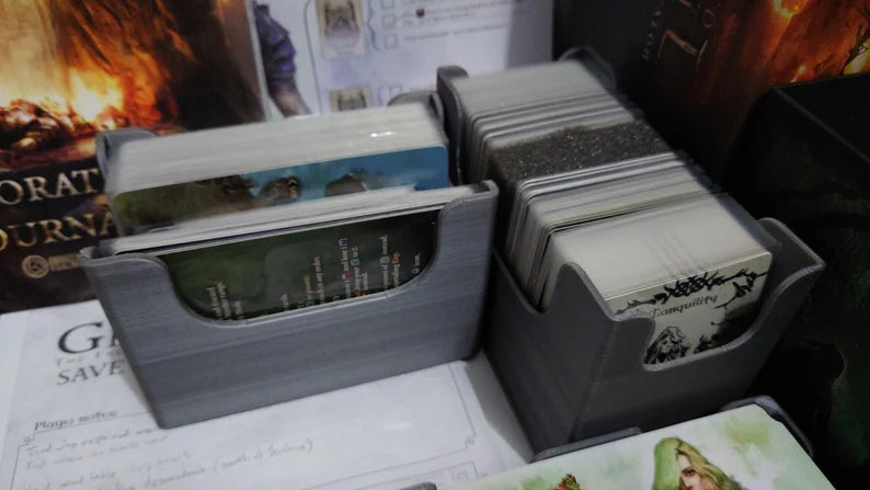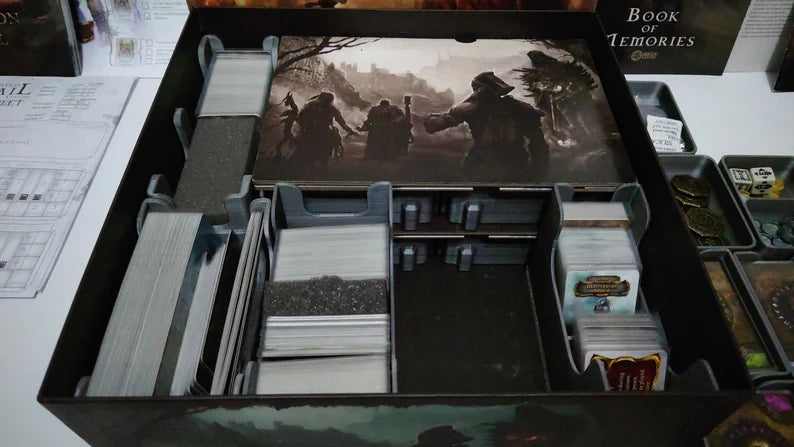 There are storage compartments for 4 characters (each of which has space for storing your character board, items, secrets, combat and diplomacy decks. The campaign exploration cards, chapter cards, items and secrets are stored in special card caddies, and there is space for the current journal book, Rules, memory sheets and the book of memories.
