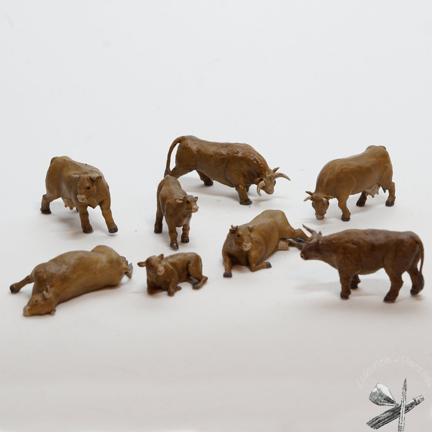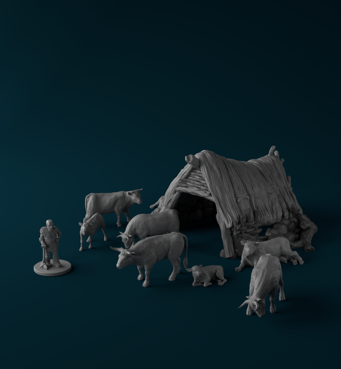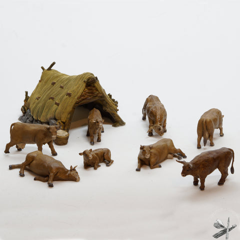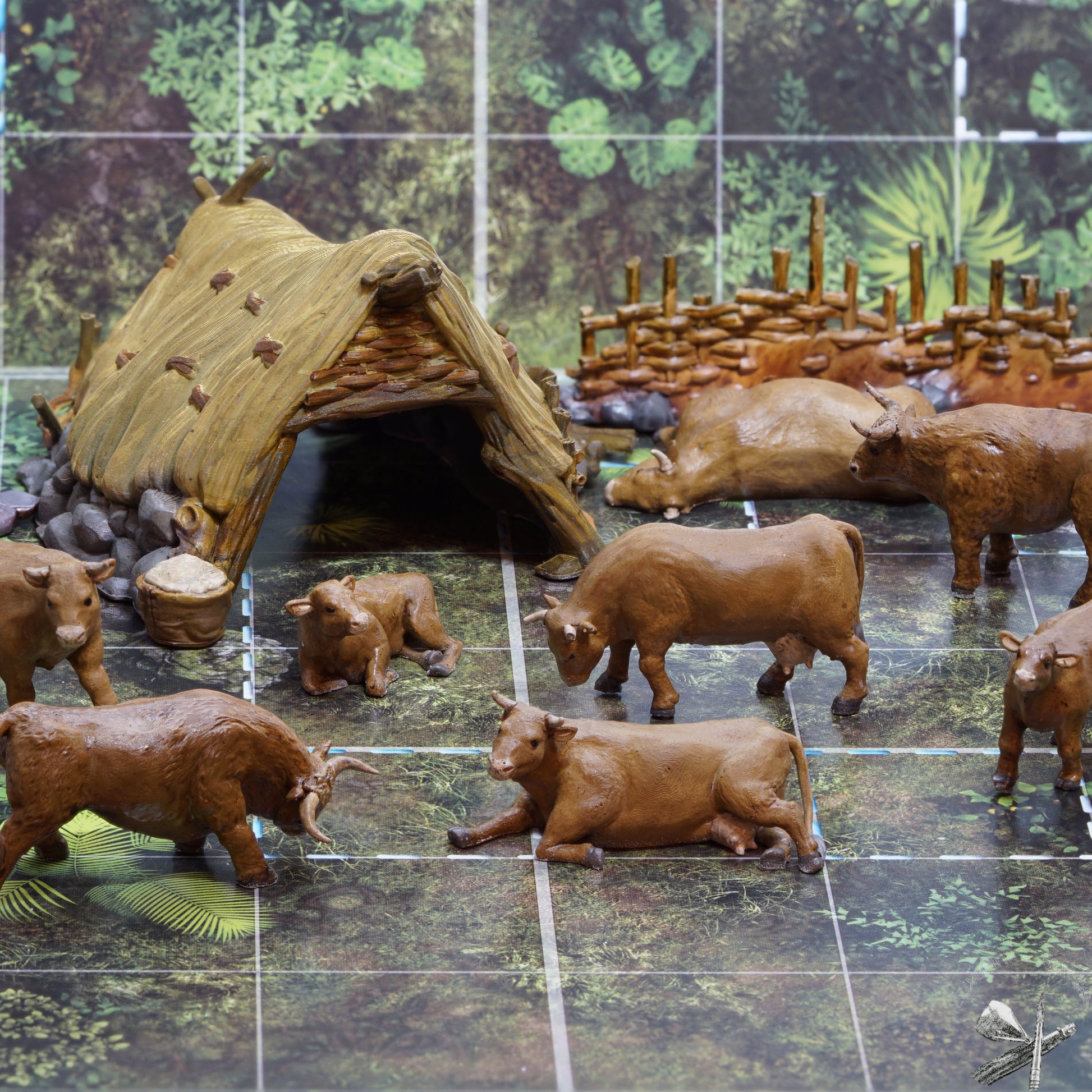 Stone Age Set of 9 parts: a hut and 8 different cow models for board games and RPGs by StoneAxe Miniatures.