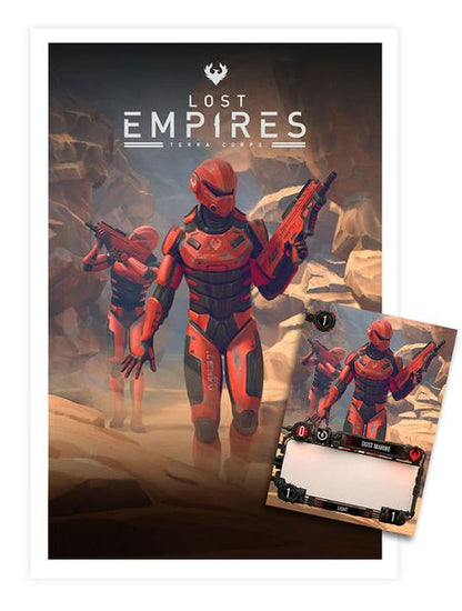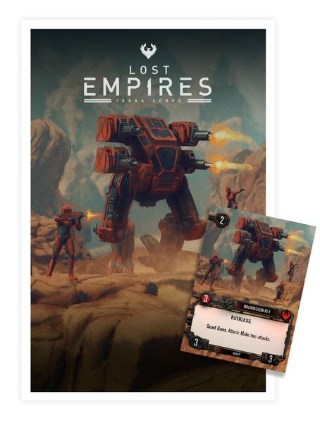 Lost Empires is a card-driven territory control game with an emphasis on tactical movement and deck design. Each player chooses a faction to play and uses the cards available for that faction to construct an 18-card deck to go into battle with. Artifacts are earned by controlling objectives and destroying elite enemy units equipped with alien technology. Once you've collected enough artifacts, use them to construct a Wormgate. Whoever builds a worm gate first wins the war for the new sun.