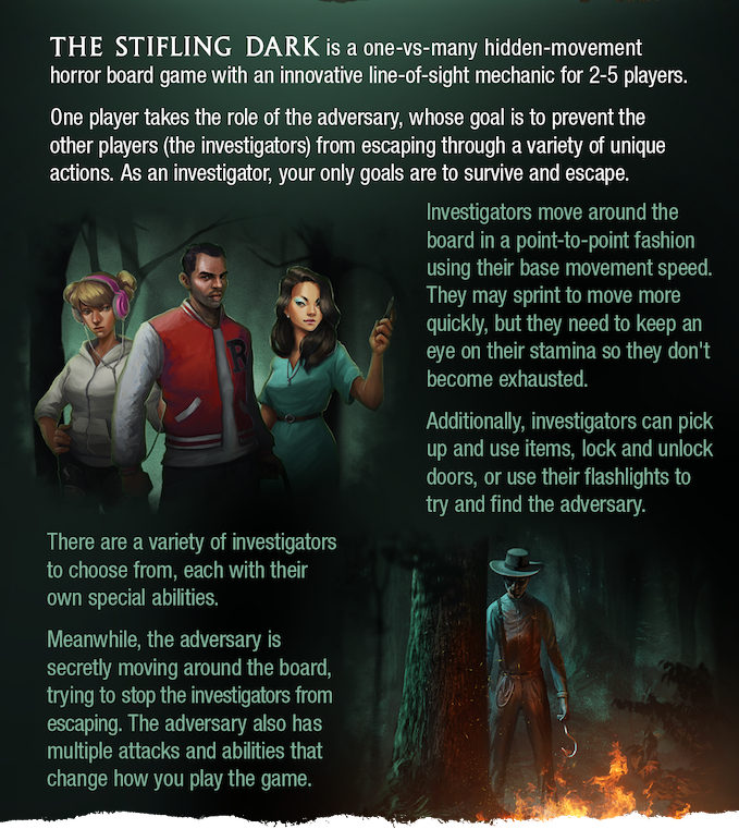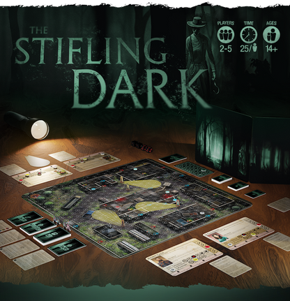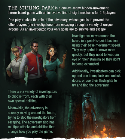 The Stifling Dark is a 2-5 player horror board game featuring an innovative line-of-sight mechanic, pitting you against multiple players. One player takes on the role of the opponent whose goal is to prevent the other players (the investigators) from escaping through a variety of unique actions. As an investigator, your only goal is to survive and escape.