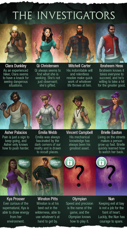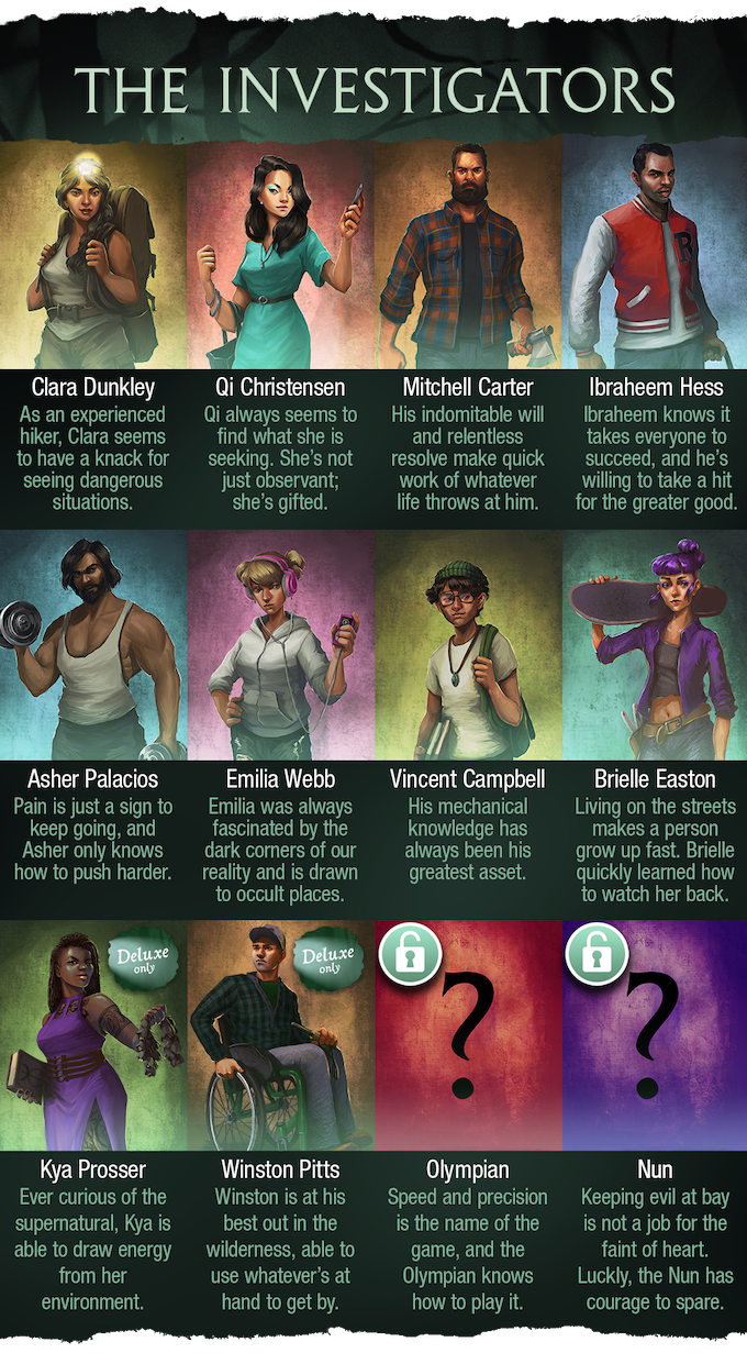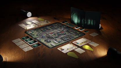 Investigators move from point to point on the board at their base speed. They can sprint to move faster, but need to keep an eye on their stamina to avoid getting too exhausted. Investigators can also pick up and use items, lock and unlock doors, or use their flashlights to locate the enemy. Meanwhile, the opponent secretly moves around the game board, trying to prevent the investigators from escaping. There are a variety of investigators to choose from, each with their own special abilities. The opponent also has several attacks and abilities that change the course of the game.