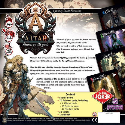 Altar: Realms of the gods ist ein Kartenspiel für 2 bis 5 Spieler. Während des Spiels kämpfst du gegen feindliche Götter und versuchst, dein Reich zu schützen. Dein Ziel ist es, Heiligtümer zu bauen und die versteckten Altäre im Reich deines Gottes zu entdecken, um sie zu aktivieren und deinen Gott zum mächtigsten von allen zu machen und das Spiel zu gewinnen!