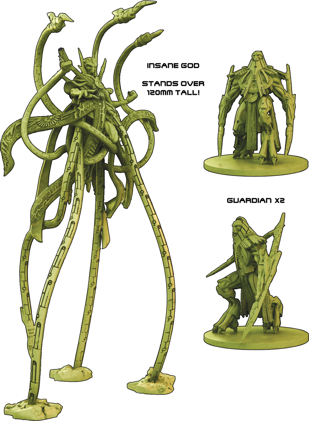 Unzufrieden mit den alten Göttern, erschuf eine fanatische Fraktion der Erstgeborenen ihre eigenen, extrem mächtigen und nahezu unzerstörbaren Götter... Diese Erweiterung fügt einen dieser Wahnsinnigen Götter hinzu, der über 120 mm groß ist und von seinen beiden gewaltigen Wächtern flankiert wird!