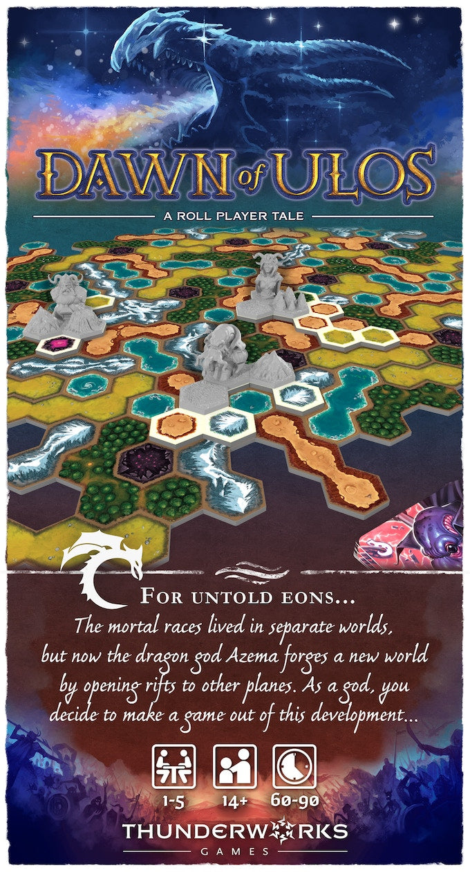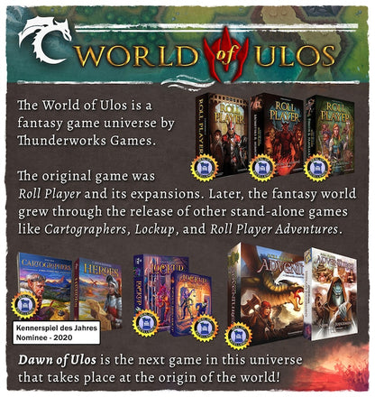 Dawn of Ulos ist ein Wirtschaftsplättchen-Legespiel für 1-5 Spieler, das in der Welt von Rollenspieler und Kartographen spielt. Sie konkurrieren in einem Spiel zwischen den Göttern des Planarversums, indem Sie auf den Aufstieg und Fall der Sterblichen wetten und diese manipulieren.