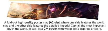 Holen Sie sich das Kampagnen-Quellenbuch, das Spielerhandbuch zu Tanares und das Abenteuer in den Reichen des Wahnsinns in einem stabilen Schuber, der einen Deluxe-Hauptschirm und eine doppelseitige A1-Posterkarte der Welt und der Kaiserlichen Hauptstadt enthält!